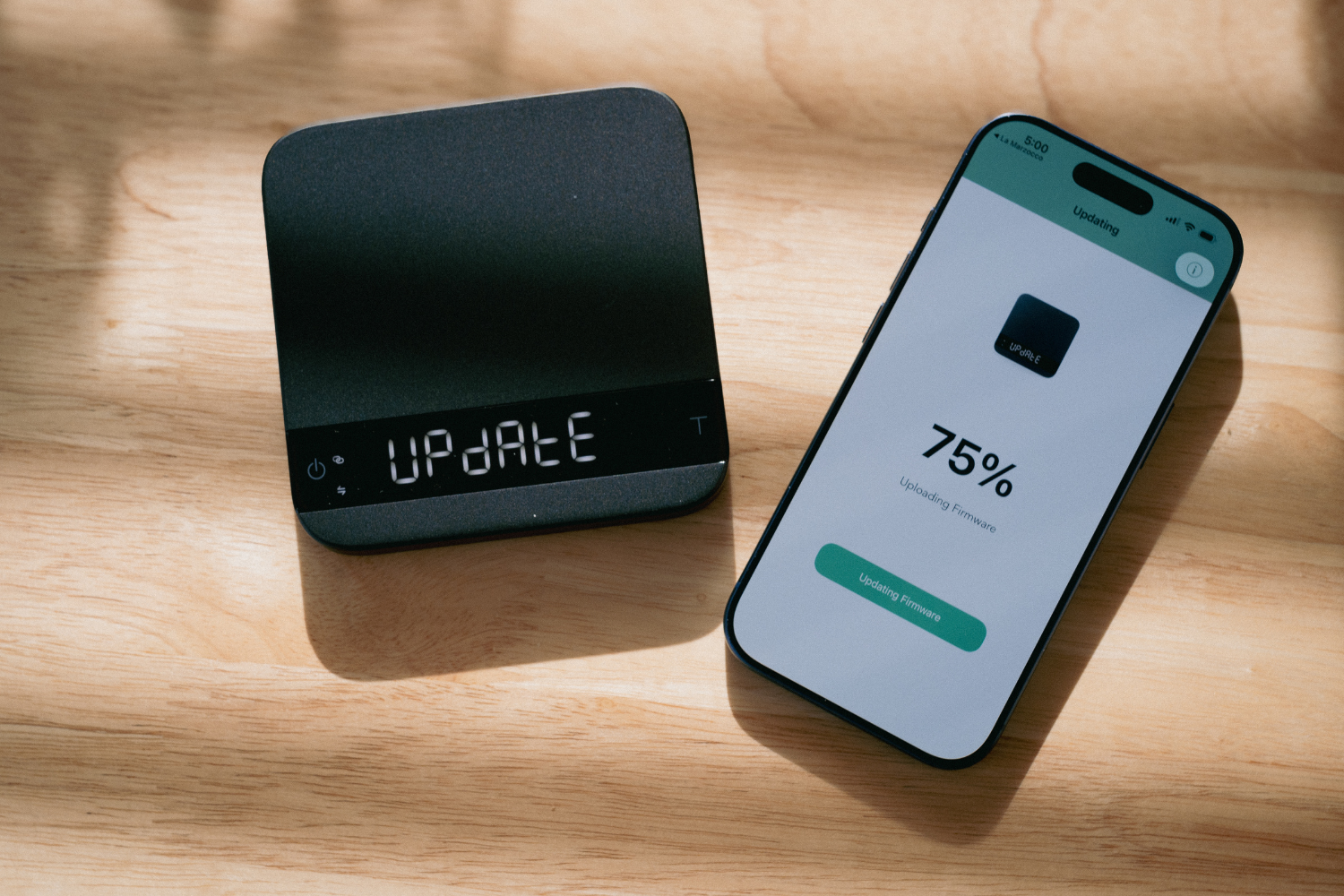 (4) Within the Acaia app, firmware installs automatically on both scales, enabling Connected Scale features. Note: this can take some time.