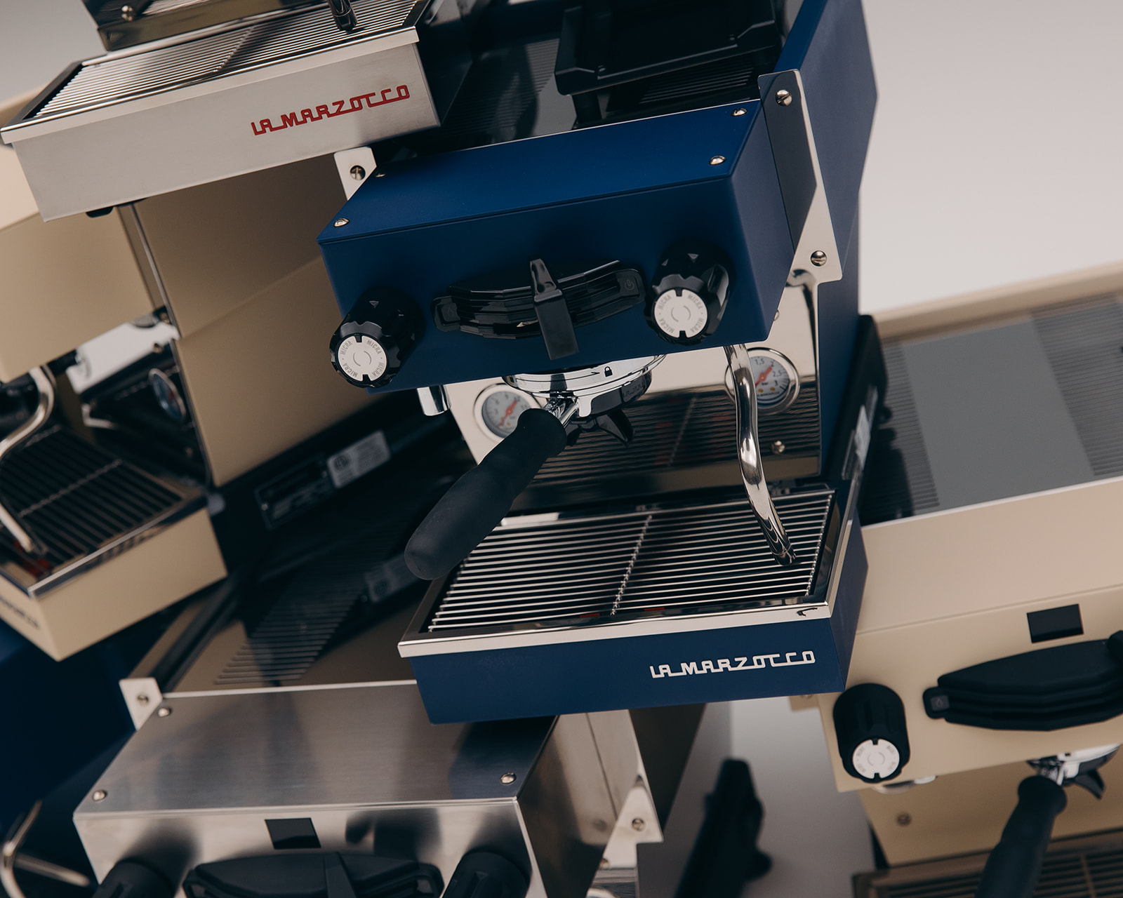 The backsplash of the Blue and Crème Linea Mini will be painted, the Brushed Steel Linea Mini will retain the reflective backsplash, and all Linea Micra backsplashes will come standard in reflective stainless steel.