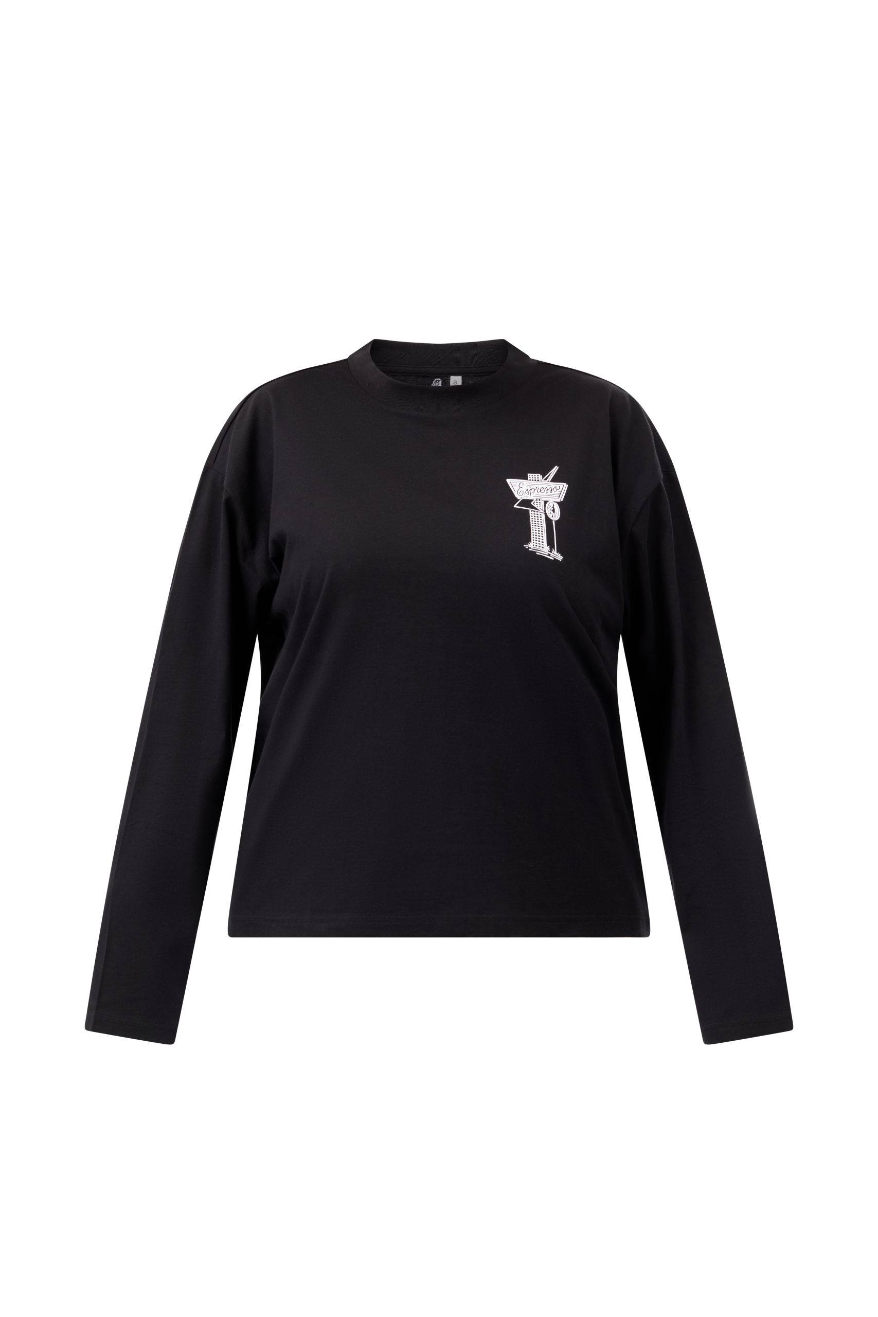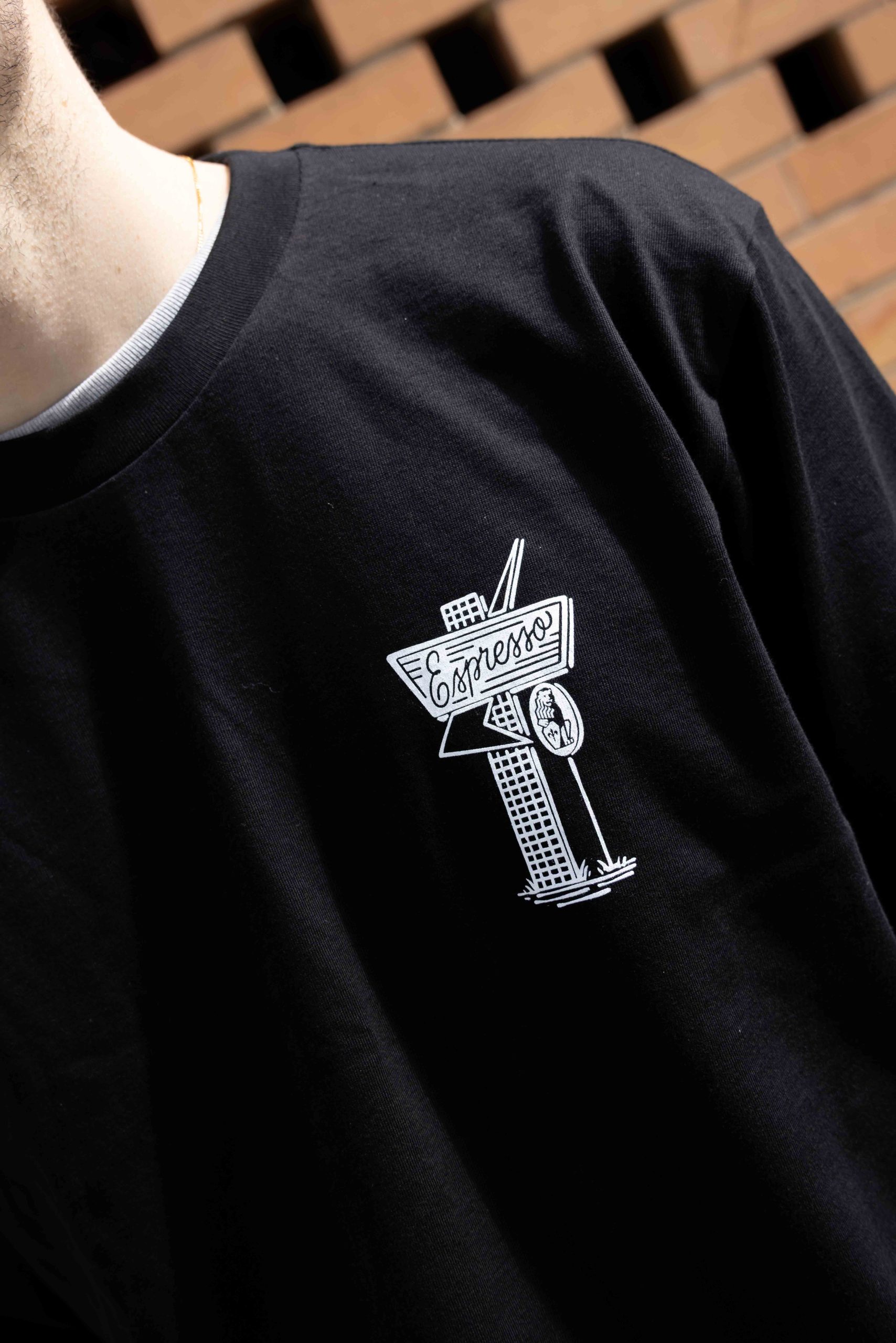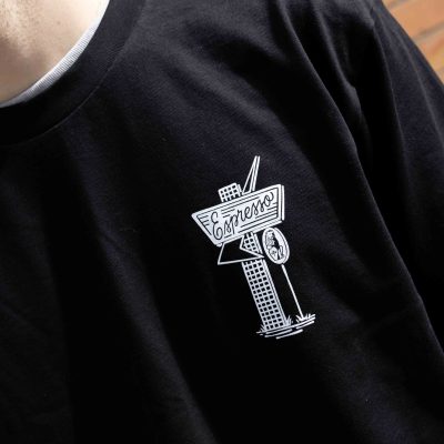 Featuring a bold, hand-drawn café illustration on the back and a matching atomic sign on the front chest, this tee channels vintage la marzocco coffee-shop vibes.