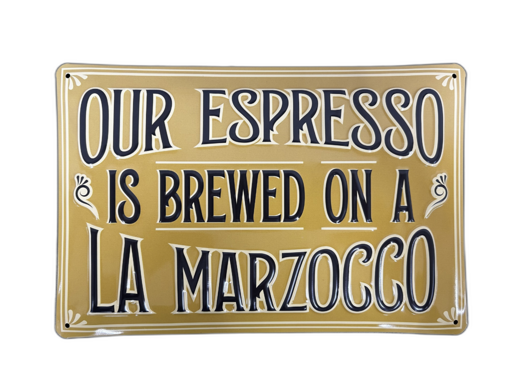Add a stylish touch to your coffee space with this vintage-inspired enamel sign. Perfect for professional baristas and coffee enthusiasts, it celebrates the excellence of coffee brewed on a La Marzocco. Ideal for cafés, kitchens, or home coffee corners.